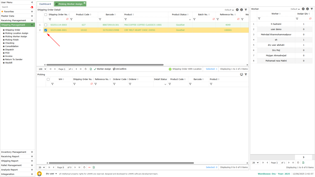 2. The confirmed items are displayed on the Picking Location Assign page, and it is possible to assign locations for them.