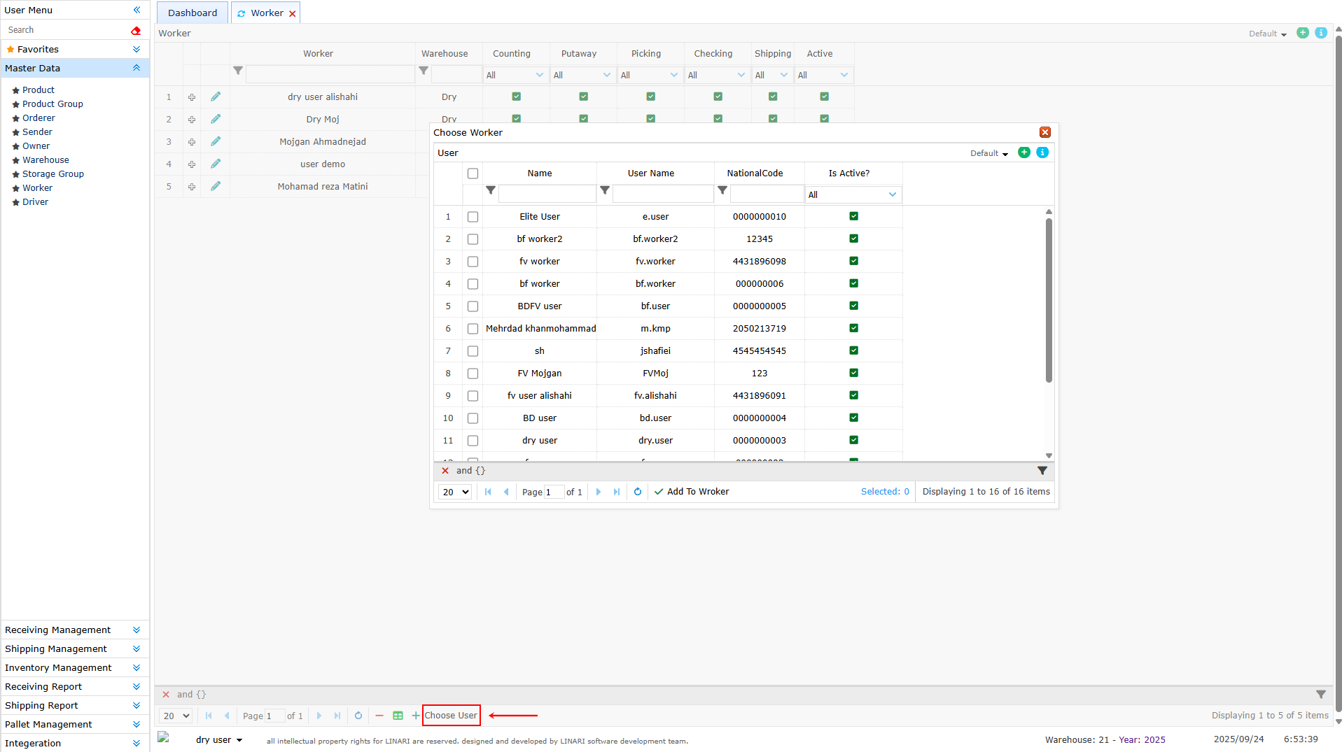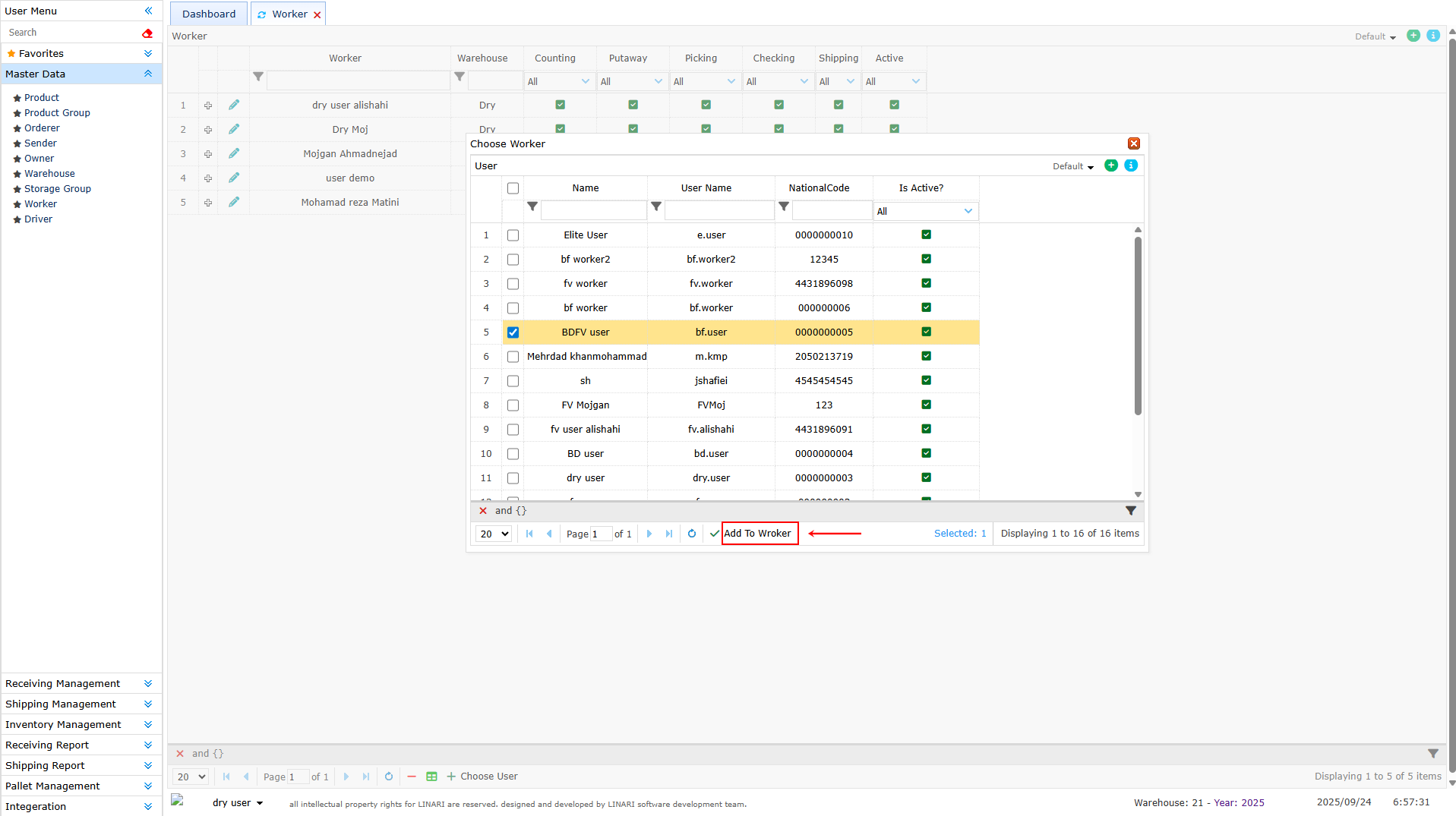 By clicking on one of the users we select it and then click the Add To Worker button. In this way the new Worker is added to this warehouse and is visible in the list of Worker.