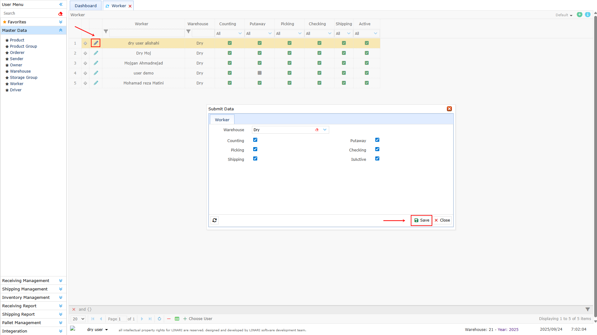 On the opened page in the Warehouse section select and register the desired warehouse then fill in the rest of the information according to the Worker’s access rights and finally click the Save button.